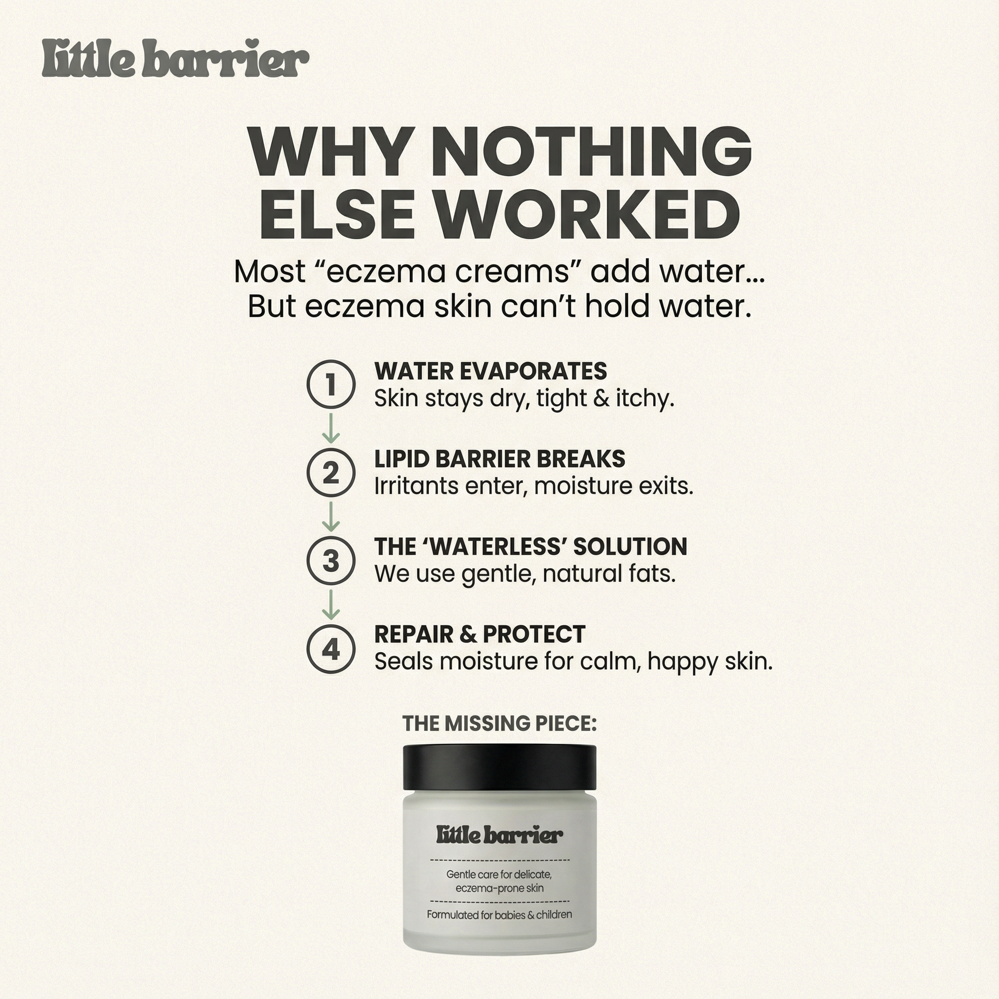 Many creams are 60–80% water and need stabilizers/preservatives. Little Barrier is an anhydrous (water‑free) lipid balm designed to support the skin barrier with skin‑compatible fats rather than “wetting” the surface and evaporating quickly.