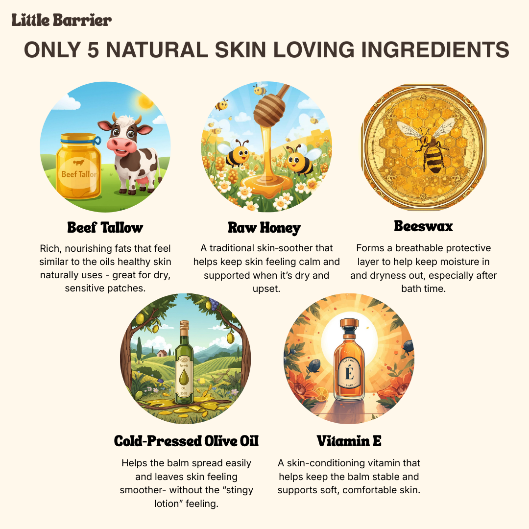 It’s a fair question—eczema-prone skin can be reactive, and many parents are cautious with anything food-adjacent. Little Barrier is a balm, not a raw food mixture: tallow is rendered and purified fat, used as a stable skincare base. Because every child’s skin is different (and sensitivities exist), we always recommend starting small and patch testing first, especially on very dry or broken areas. Avoid if: your child has a known sensitivity to any listed ingredients (including bee products).